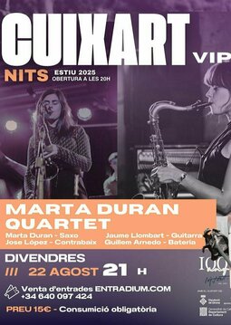 Marta Duran Quartet – la saxofonista i compositora ens presenta un repertori fresc i emocionant, amb influències del jazz tradicional, la música brasilera i el pop. Les seves peces són melòdiques, intenses i plenes de sensibilitat.